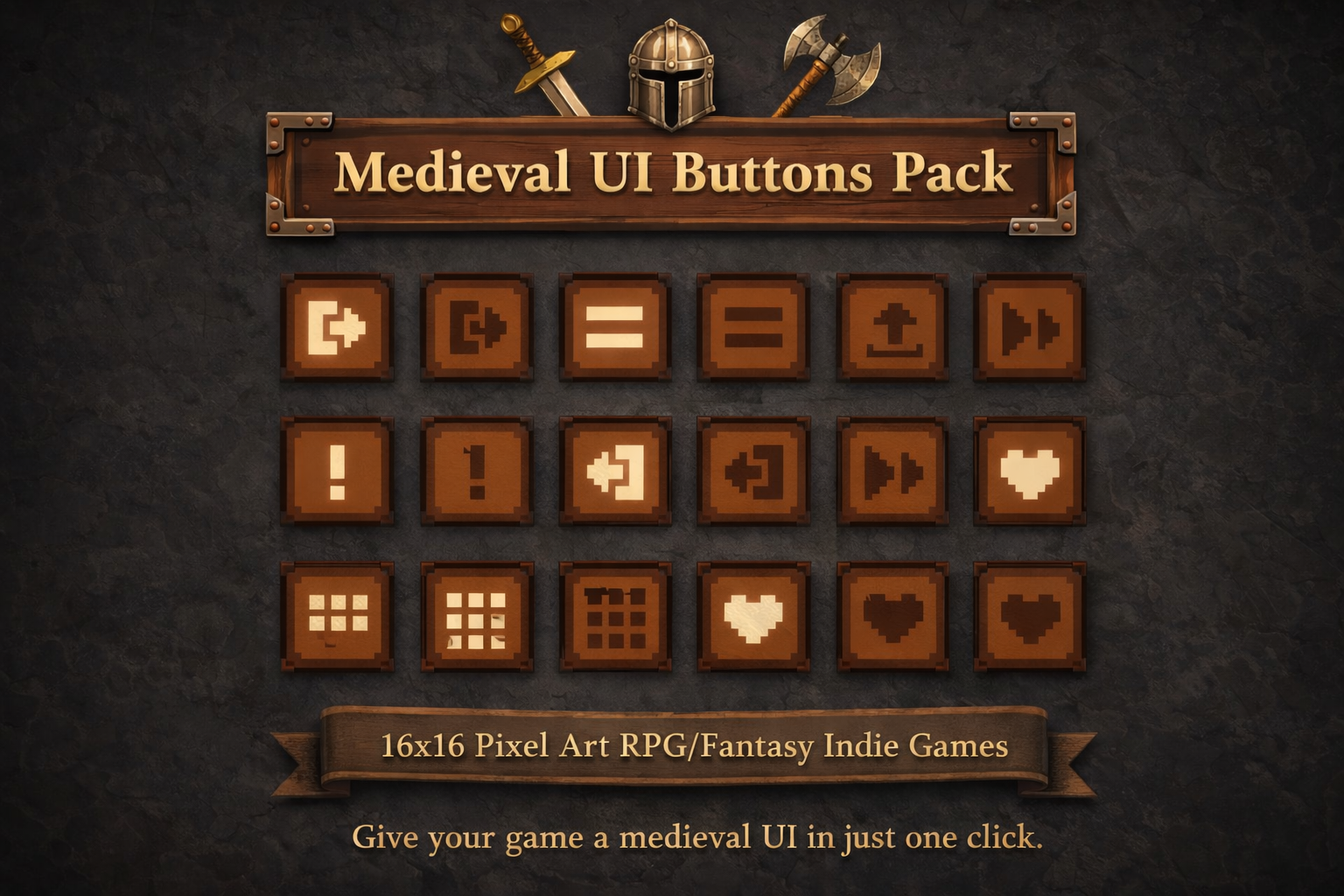 A collection of 50+ handcrafted 16x16 pixel art UI buttons, designed for medieval, RPG, fantasy, and retro indie games.